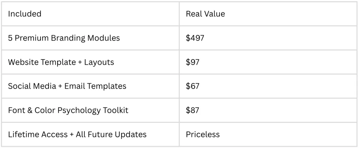 → You don’t need to. This course gives you $10,000+ worth of strategy, design psychology, templates, and launch assets — for less than the cost of one branding call.